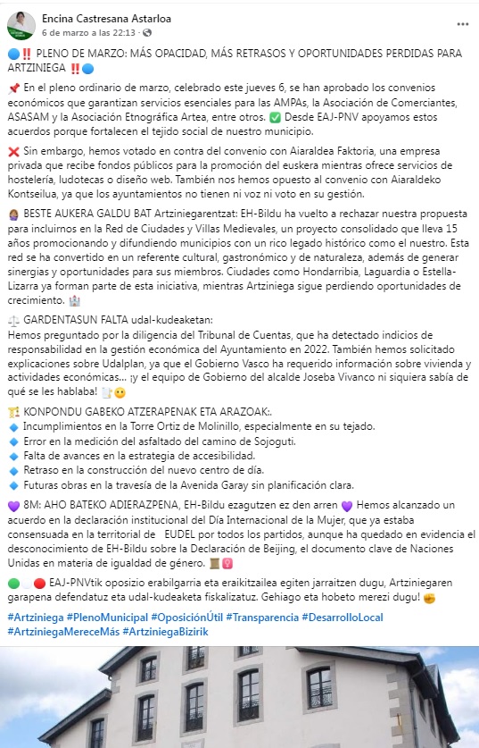 Martxoak 6, Encina Castresana Aiaraldeko Kuadrillako lehendakari ohia eta Artziniegako zinegotziak, gaztelaniaz, honakoa zioen Aiaraldeko Euskalgintzaren Kontseiluaz bere facebook kontuan: “Aiaraldeko Euskalgintza Kontseiluarekin hitzarmena sinatzearen kontra azaldu gara,udalak ez baitu bertan ez ahotsik ezta bozkarik ere.”